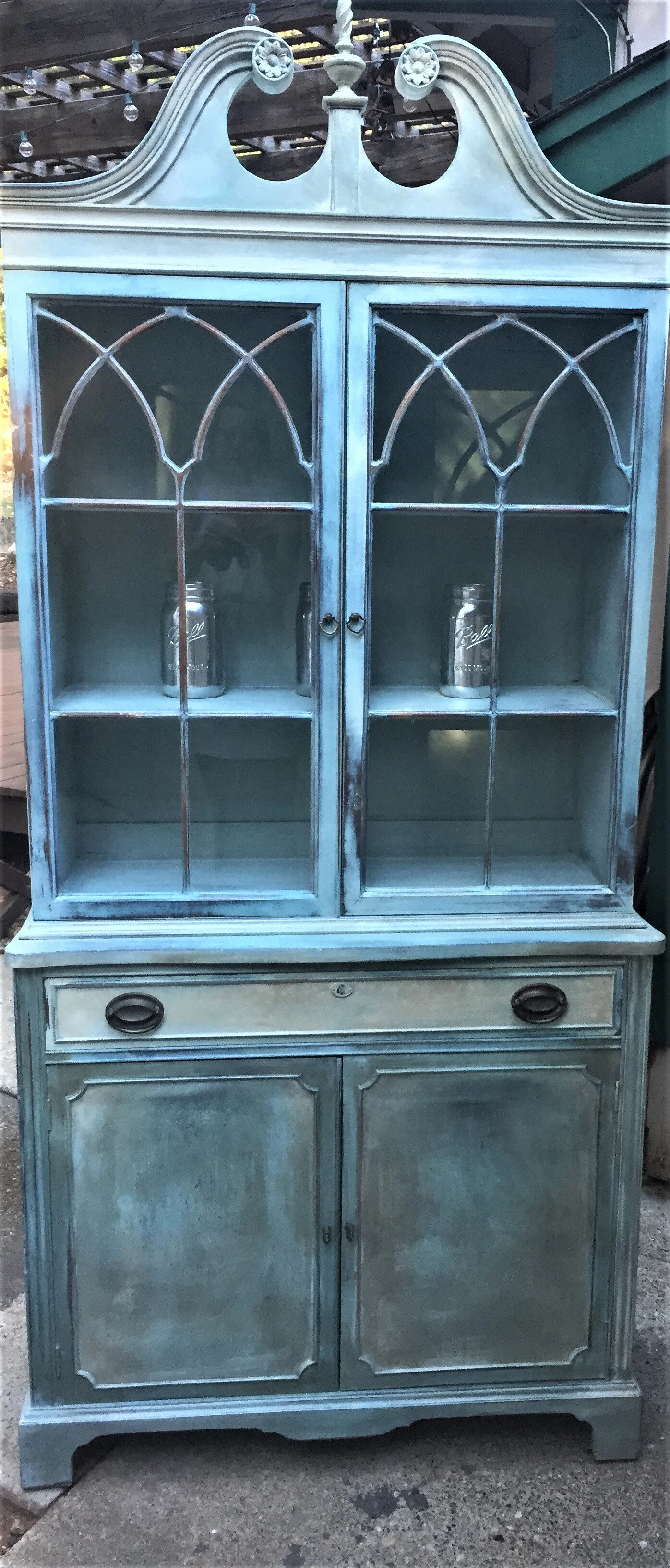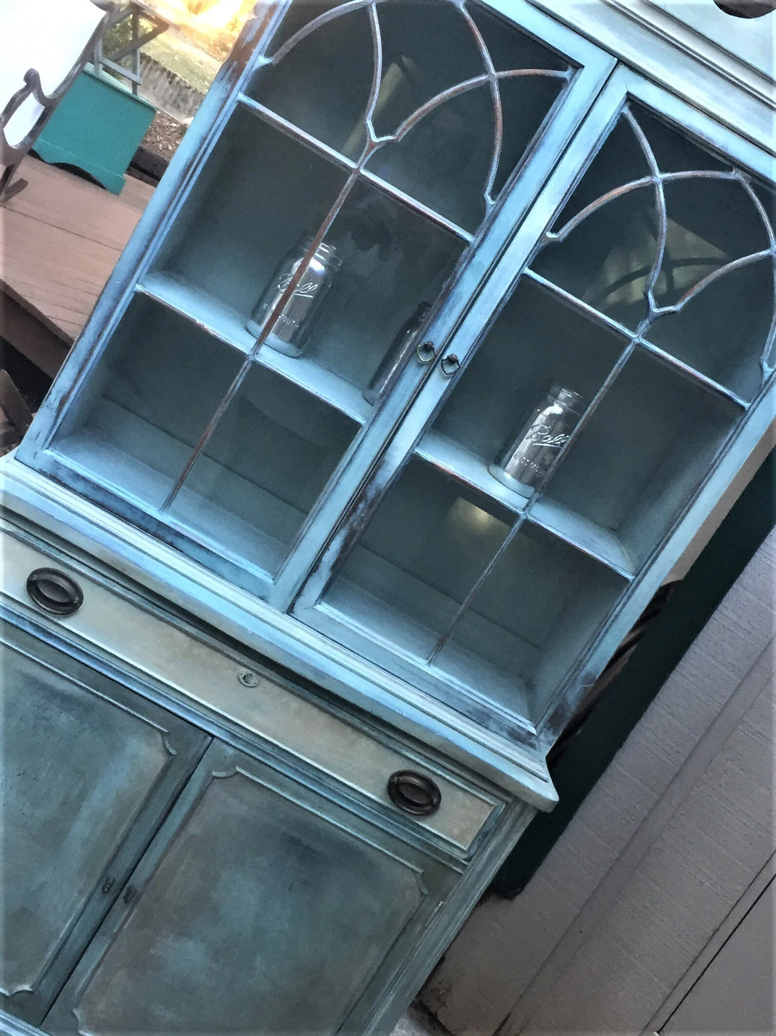 This one of a kind antique was rescued from a sale. She sat alone for quite along time until I discovered her beauty and changed her into something ethereal. Blues and whites blended together fabulously; overlapping almost effortlessly one into the other like a woven tapestry, coming into a dream of an existence. Finishing off with different color waxes set the stage for her new home.